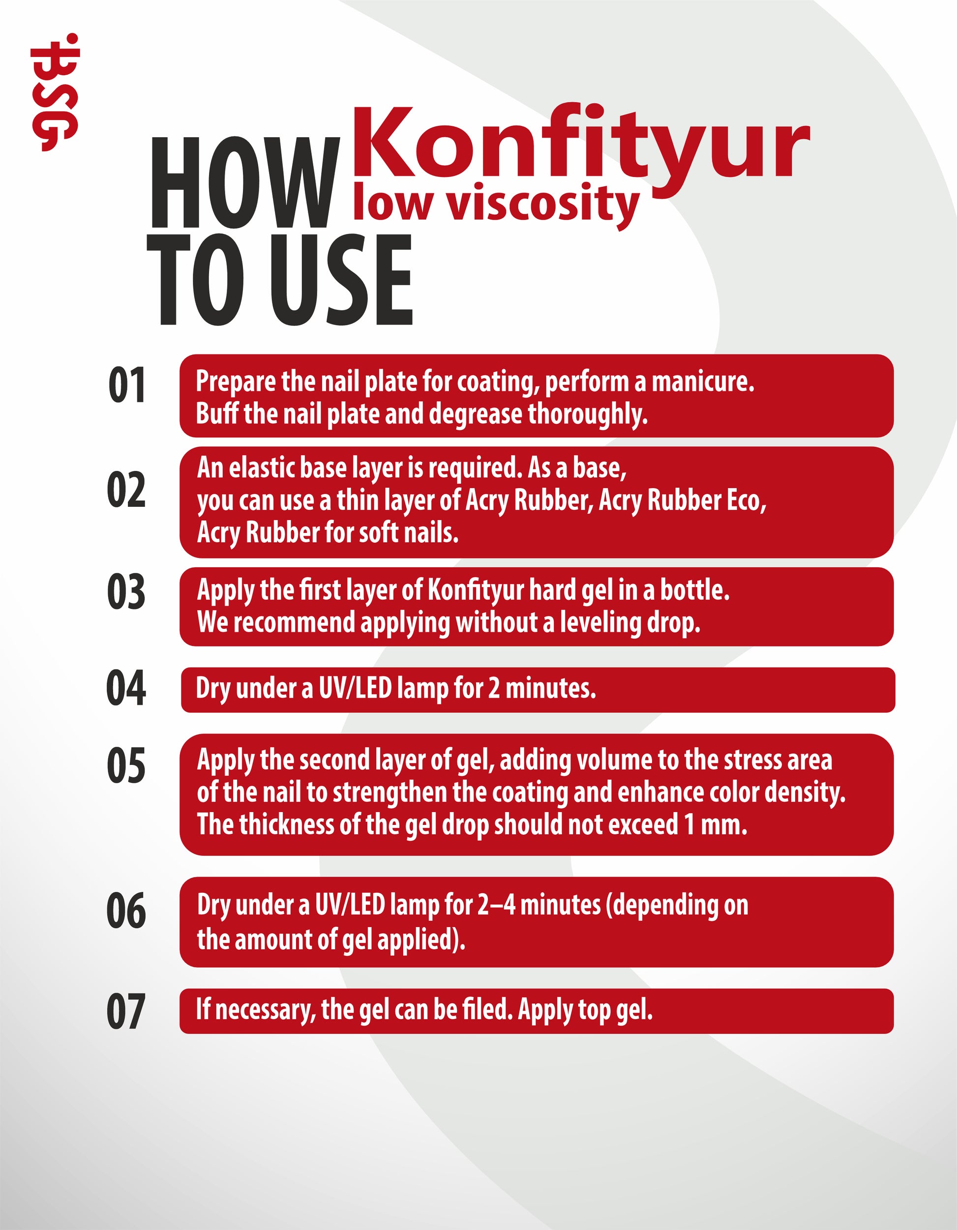 BSG Konfityur Bio Gel in a Bottle is a premium builder gel that blends the benefits of gel polish and hard gel in one innovative formula. This thin-layer builder gel has a rich, highly pigmented color and a fluid, self-spreading texture that applies evenly without streaks or flooding, allowing precise application close to the cuticle.